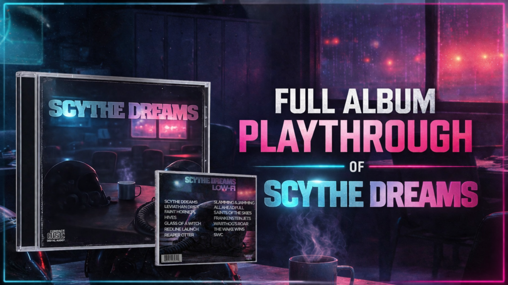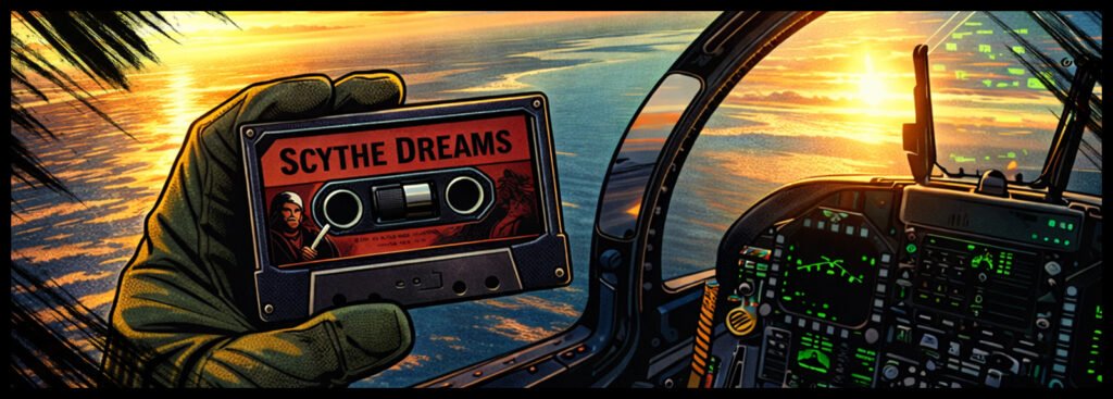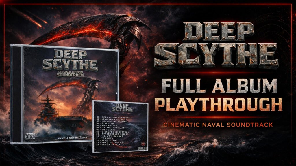 The music of Deep Scythe is the sound of CVW-0 brought to life, steel, salt, and afterburner translated into rhythm. It pulls from the same DNA as the world of the Wet Boys: aggressive, cinematic, and unapologetically immersive. Tracks move like missions. Some launch hard with pounding industrial beats and distorted guitars, while others drift into atmospheric, sonar-soaked soundscapes that feel like flying low over black water at night. You hear the carrier deck in the percussion, the radar sweep in the synths, and the weight of command in the orchestral swells. It is not just an album. It is an extension of the universe, designed to be felt as much as heard.